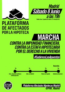 La marcha tendrá como punto de salida la calle Velázquez, 66 (sede de la Asociación Española de Banca). Como motivo de protesta se realizará una parada en el Ayuntamiento de Madrid y otra en el Banco de España. La marcha terminará su recorrido en la Audiencia Nacional. La Plataforma de Afectados por las Hipotecas de Madrid junto con otros colectivos, convocamos una gran marcha ciudadana a través del siguiente manifiesto: Los principales responsables de la crisis se encuentran en los consejos de administración de las entidades financieras. Desde el estallido de la crisis centenares miles de millones de euros públicos han sido destinados al rescate de las entidades financieras, mientras sus propietarios han tomado constantes decisiones con el objetivo de incrementar su capital y enriquecerse aún más a costa de los derechos fundamentales de las grandes mayorías sociales. Los poderes públicos han cargado la factura de las entidades financieras al conjunto de la población en forma de salvajes recortes sociales y en privatización de bienes colectivos. Se están recortando servicios públicos tan básicos que limitan nuestro derecho a la salud, a la educación y a la vivienda, y se han ensañado con los sectores más vulnerables: personas pensionistas, paradas, precarias, dependientes, jóvenes, mujeres, migrantes. Además, centenares de miles de viviendas están siendo acumuladas por las entidades financieras en clamorosa comisión del delito consistente en acaparar un bien de primera necesidad con la finalidad de alterar artificialmente el precio de las cosas. Cuatrocientas mil ejecuciones hipotecarias han sido realizadas desde que estalló la crisis. Las hipotecas basura fueron creadas por las entidades financieras durante la burbuja inmobiliaria. La comercialización de hipotecas se ha mostrado altamente perjudicial y ha seguido una práctica generalizada que no podemos denominar nada más que como una estafa sistemática. Las entidades financieras engañaron acerca de los verdaderos riesgos que corrían las personas al firmar una hipoteca. Comercializaron productos financieros altamente tóxicos con el dramático resultado de centenares de miles de ejecuciones hipotecarias, desahucios y deudas perpetuas, basados en una norma declarada ilegal por la Sentencia del Tribunal de Justicia de la Unión Europea de 14 de marzo de 2013. La estafa hipotecaria y las ejecuciones hipotecarias masivas tienen gravísimas consecuencias para las personas que se han concretado en una violación sistemática de los derechos humanos. La sentencia de Tribunal de Justicia de la Unión Europea ha evidenciado que existen responsables políticos y administrativos de la no trasposición a la normativa española de la Directiva Europea 93-13 en grave perjuicio para los deudores habitacionales con el resultado de centenares de miles de ejecuciones y desahucios ilegales realizadas por los Tribunales a instancia de las entidades financieras. Cientos de miles de víctimas de violaciones de derechos humanos exigen se depuren responsabilidades. La actividad del capital financiero ha sido criminalmente responsable de la situación actual mientras resulta clamorosa la inacción de los poderes públicos – Ministerio del interior, Fiscalía y Judicatura – o más allá, sus actuaciones en defensa directa de sus intereses. Criminalizando, por contra, la práctica política de resistencia de los colectivos que se oponen a esta actividad especulativa. Después de la recogida de más de un 1.400.000 firmas, las Cortes han consumado el rechazo a la Iniciativa Legislativa Popular que planteaba la moratoria de desahucios, la dación en pago retroactiva y el alquiler social. A pesar de todo, la mayoría de la sociedad sigue apoyando las propuestas contenidas en la ILP. Hicimos una propuesta de mínimos, una propuesta de emergencia social, y la rechazaron. Ante este recorte de derechos y de libertades hacemos una llamada al conjunto de la sociedad civil a ponerse en marcha contra la estafa hipotecaria y la impunidad financiera. La lucha continua. No vamos a permanecer parad@s. Seguimos adelante, Subimos las apuestas, por el derecho a la vivienda para tod@s, contra la impunidad financiera y contra la estafa hipotecaria. ¡¡Sí se puede!!