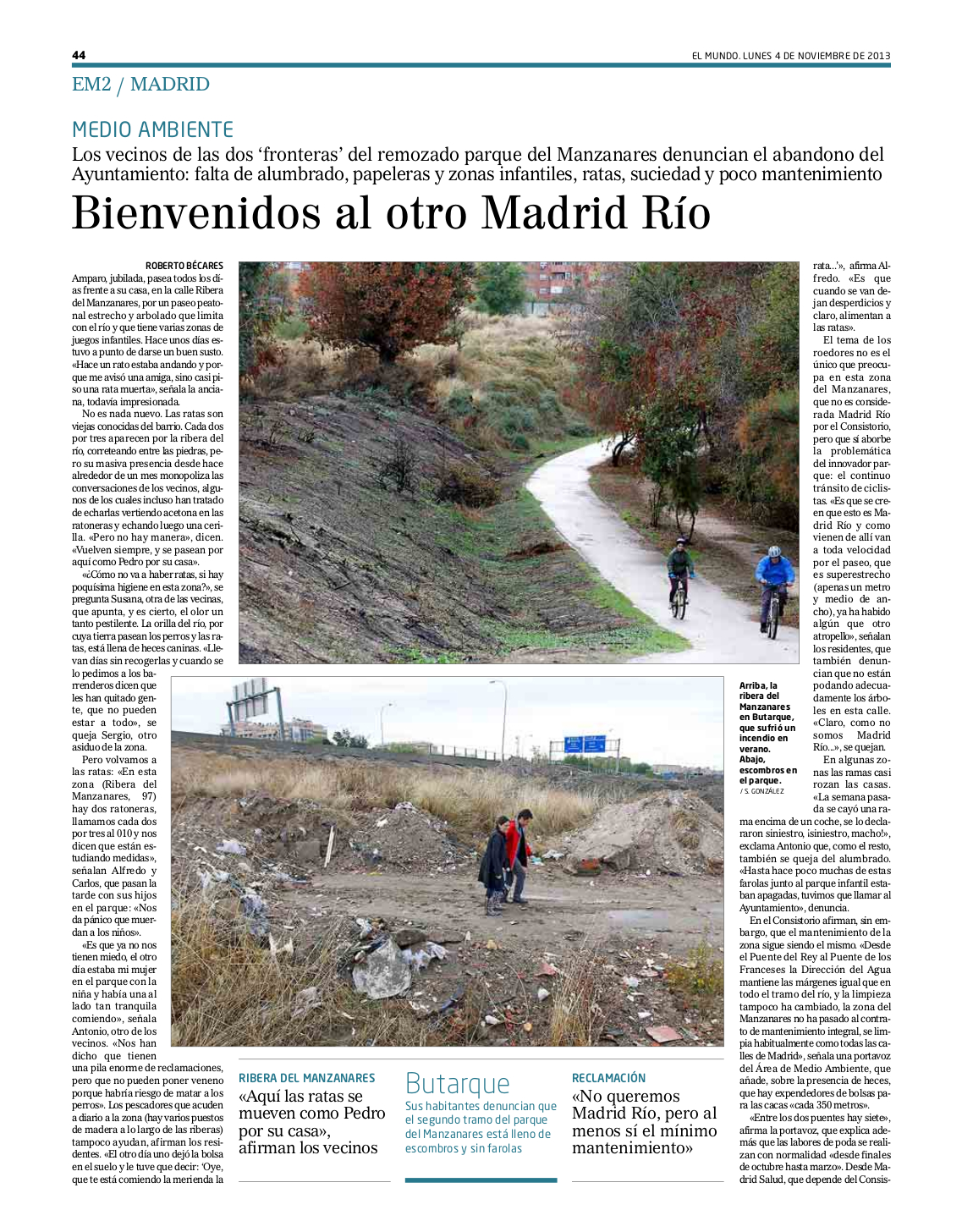 En la campaña de 2007, el ex alcalde de la ciudad Alberto Ruiz-Gallardón ya prometió «desarrollar la segunda fase del parque lineal del Manzanares hacia el sur, actuando sobre una superficie de 200 hectáreas». Según decía en el programa electoral, se «restaurarían» las riberas del río, se crearían masas forestales y espacios ajardinados con «112.000 nuevos árboles». A día de hoy, la promesa sigue en un cajón y todas las actuaciones que se han hecho en la zona la han perjudicado. «Durante mucho tiempo hemos tenido las farolas rotas, y ni siquiera las retiraban, hasta había un coche quemado y abandonado», señala Antonio Abueitah, también de la asociación. Los servicios municipales también retiraron las pocas zonas de juegos infantiles que había. «Es una pena, para nosotros este parque es una joya, la gente del barrio le da mucho uso; se vienen a correr, a pasear al perro, a andar, con la bici, había fuentes y también las quitaron, todo ha ido a peor», afirma Isabel, que pasea al perro todos los días por aquí. «Con todos los millones que se dejó Gallardón en el parque de Madrid Río y aquí no vino nada, esto está abandonado», señala Marcelo, un jubilado que visita asiduamente el parque. Esporádicamente, algunas personas lanzan residuos a determinadas zonas y nadie viene a recogerlos: electrodomésticos o cristales, por ejemplo, que, sumados a que algunas tapas de las instalaciones de cableado se han quitado, se conviertan en un peligro para los niños que acuden en masa el fin de semana. «La diferencia está en cuánto se gastan en el mantenimiento de Madrid Río [tras costar 410 millones de euros, su mantenimiento es de casi un millón al mes, según IU] y cuánto se gastan aquí, es que nosotros no pedimos tener Madrid Río pero sí al menos que lo cuiden un poco, que pongan papeleras e iluminación», añade Parra. Desde Medio Ambiente replican que esta zona «no es un parque ni tiene que ver con el parque lineal del Manzanares», aunque así se recogía en el programa electoral del PP. «Esa zona está calificada como zona verde sin desarrollar, por lo que no tiene el mantenimiento de un parque, pero sí se están llevando a cabo actuaciones básicas», señala una portavoz, que afirma que al Ayuntamiento le gustaría actuar más allí, pero ahora no se puede «por los límites presupuestarios». Los vecinos insisten en que el Plan General de Ordenación Urbana sí lo considera un parque. «Es que es un gran corredor medioambiental», señalan desde la Asociación de Vecinos de Villaverde, que recuerda que Gallardón incluso planificó para esta zona «la construcción de un Centro de Iniciativas Ambientales». Como todo lo demás, la promesa se quedó en papel mojado.