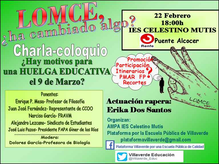 Queridos compañeros, queremos invitaros al acto que se va a celebrar en el IES CELESTINO MUTIS (próximo día 22 de febrero,18:00h) en relación a la convocatoria de huelga del próximo 9 de Marzo.