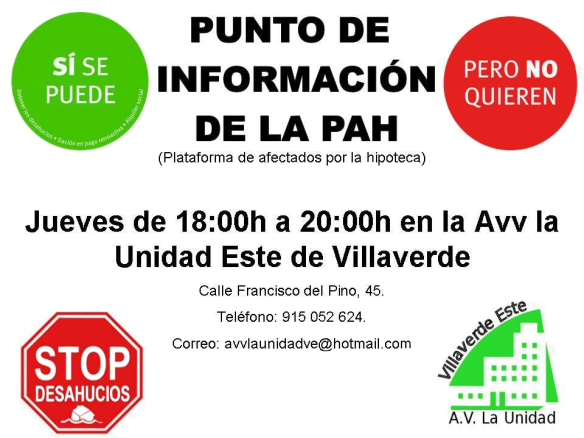 Nueva Campaña: Paremos los desalojos! Entre 2007 y 2011 se producirán cerca de 500.000 ejecuciones hipotecarias en el estado español. Centenares de miles de familias que serán desahuciadas de sus casas por las mismas entidades financieras que han provocado la crisis y que han sido rescatadas con dinero público. Es inadmisible e intolerable que en un Estado Social y Democrático de derecho se estén produciendo centenares de miles de desalojos a la vez que existen millones de pisos vacíos que no están cumpliendo su función social. Las administraciones publicas, lejos de dar respuesta a esta situación de emergencia habitacional y detener la sangría de desalojos, parece más dispuesta a amparar y proteger los intereses de las entidades financieras que a defender los derechos mas elementales de la ciudadanía. Los poderes públicos están siendo cómplices de la vulneración de este derecho básico, incumpliendo el marco jurídico estatal, así como diversos tratados internacionales que han sido ratificados por el estado español: Se vulnera el artículo25 de la declaración universal de los derechos humanos, que dice: “Toda persona tiene derecho a un nivel de vida adecuado que le asegure, así como a su familia, la salud y el bienestar, y en especial la alimentación, el vestido, la vivienda, la asistencia médica y los servicios sociales necesarios;…” Se vulnera el artículo 11 del Pacto Internacional de Derechos económicos, sociales y culturales, donde dice que el estado esta obligado a hacer todo lo posible por impedir los desalojos forzados por motivos económicos. Y que en caso de no evitarlos, debe velar para que se cumplan todas las garantías procesales y un realojo digno y adecuado para las familias. España firmo y ratifico este pacto, por lo que está obligada a respetarlo. Se vulnera el artículo 47 de la Constitución Española, que dice literalmente: “Todos los españoles tienen derecho a una vivienda digna y adecuada. Los poderes públicos promoverán las condiciones necesarias y establecerán las normas pertinentes para hacer efectivo este derecho, regulando la utilización del suelo de acuerdo al interés general para impedir la especulación. La comunidad participara en las plusvalías que genere la acción urbanística.” Los desalojos por causas económicas (es decir, por falta de ingresos), no sólo atentan contra las necesidades más elementales de la población en un contexto de crisis, sino que además incumplen con la legalidad del propio estado. Ante la vulneración sistemática de nuestros derechos, la Plataforma de Afectados por la Hipoteca hace un llamamiento a la acción. Estamos convencidos que ha llegado el momento de alzar nuestra voz y gritar: ¡No permitiremos mas desalojos! ¡No dejaremos que el banco nos eche de casa! ¿No permitiremos que sigáis traficando con nuestras necesidades! Por qué parar los desalojos. La situación hipotecaria que viven miles de familias y la sobreprotección jurídica que ostentan las entidades financieras en nuestro país, es única en el mundo. La visibilidad de nuestra problemática tanto en los medios de comunicación como en la agenda política no es proporcional a la magnitud ni a las dimensiones de la tragedia que estamos viviendo. Ni a los bancos ni a los poderes públicos les interesa que hagamos demasiado ruido. Los unos porque no quieren ver mancillada su imagen corporativa ni aquí ni en el resto del mundo. Los partidos políticos porque tampoco quieren proyectarse hacia la opinión publica y hacia el mundo como lo que son: auténticos estados fallidos incapaces de satisfacer las demandas mas elementales de sus conciudadanos. Por eso quieren que nos marchemos de nuestras casas en silencio. Que abandonemos nuestros hogares sin hacer ruido. Temen que nos organicemos y que empecemos a hacer frente a los desalojos. Resistir a los desahucios significa desafiarles, plantarles cara, mirarles de igual a igual. Nuestra casa es nuestra fuerza, y si nos vamos sin lucharla es como si nos rindiéramos sin plantar batalla; es como retirarnos sin haber medido nuestras fuerzas; es como entregarnos antes de tiempo. Nuestra casa es nuestro instrumento de lucha; nuestra palanca de presión; nuestra mejor aliada.